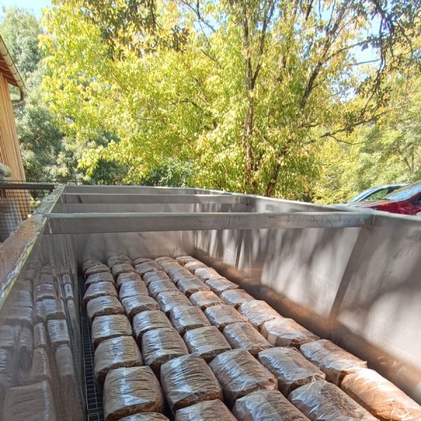 Les différents éléments sont mélangés puis ajustés à la bonne humidité (environ 65 %) avant d’être conditionnés dans des sacs de culture. Ces sacs subissent ensuite un traitement thermique, appelé pasteurisation, dont l’objectif est de préparer le substrat pour l’implantation des futurs champignons.